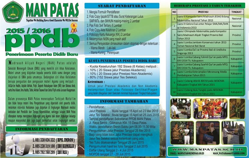 Untuk calon Siswa/Siswi Baru yang ingin mendaftar di MAN Patas, bisa baca syarat dan ketentuannya pada brosur dibawah ini.